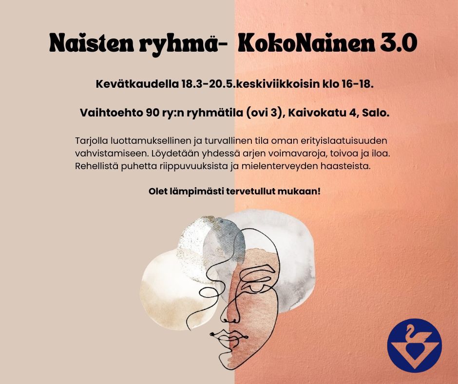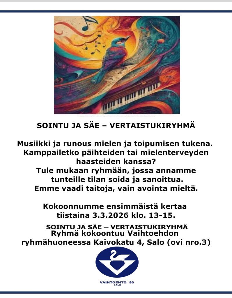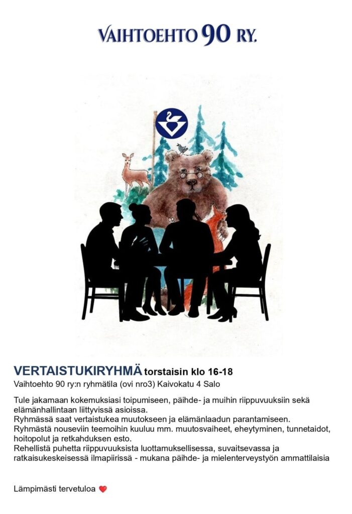 Vertaistukiryhmä kokoontuu torstaisin klo 16-18 Vaihtoehdon ryhmähuoneessa (ovi nro. 3)